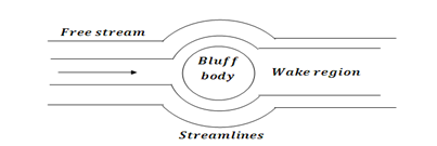 A bluff body is defined as that body whose surface is not aligned with the stream-lines, when placed in the flow. Thus, the body offers less resistance in terms of Viscous/Frictional drag. There is a very large pressure drag, due to eddy formation after the body leading to a large wake region. Thus the pressure drag depends on the cross sectional area of the body rather than the surface area exposed.