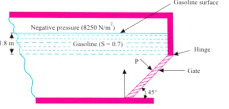 ![A 3.6 m square gate provided in an oil tank is hinged at its top edge. This tank contains gasoline (s=0.7) upto a height of 1.8 m above the top edge of the plate. The space above the oil is subjected to a negative pressure of 8250 N/`m^2`. Determine the necessary vertical pull to be applied at the lower edge to open the gate.\r\n[GATE]](/img-uploads/1579781554.jpg)