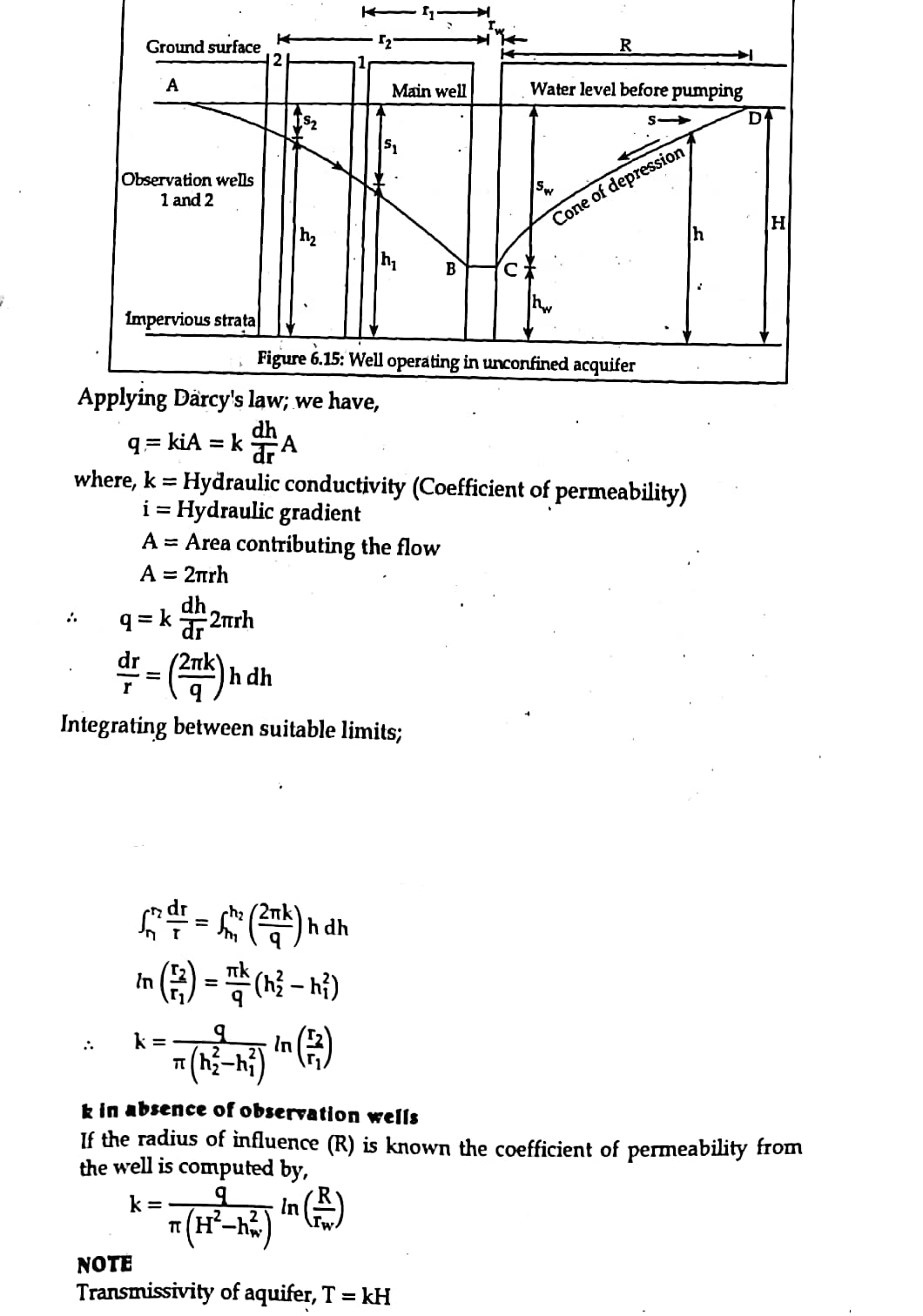 Figure below is a schematic diagram illustrating pumping out test in an unconfined aquifer.