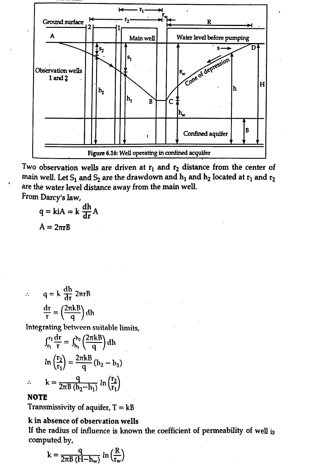 The figure 6.16 is a schematic diagram illustrating pumping out test in the confined aquifer.