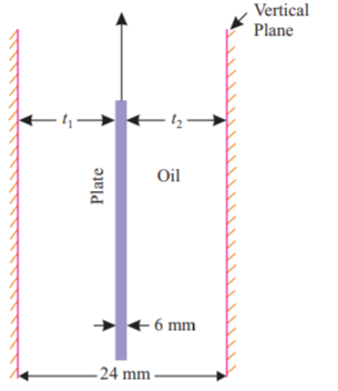 A metal plate 1.25m ** 1.25 m ** 6 mm thick and weighing 90 N is placed midway in 24 mm gap between two vertical plane surface as shown below. The gap is filled with an oil of specific gravity 0.85 and dynamic viscosity 3 Ns/`m^2`. Determine force required to lift plate with a constant velocity of 0.15 m/s.