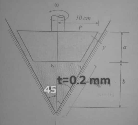 Oil of viscosity `mu=0.20`Ns/`m^2` fills small gap of thickness y=0.2 mm as shown in figure. Neglecting fluid stress exerted on circular underside, find torque required to rotate truncated cone at speed of 90 rpm. What is rate of heat generation, in joules per second, if value of `alpha=45^0` a=45 mm and b=60 mm.