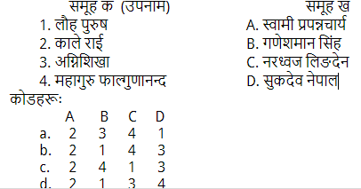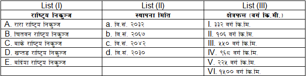 1. निर्देशनः तलको तालिकाको आधारमा List (I) संग List (II) र List (III) लाई मिलाई तलका प्रश्न १ , २, ३ र ४ को सही उत्तर छान्नुहोस्।