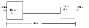 1. A bar is subjected to a tensile load of 150kN. If stress in middle portion is limited to 160 N/mm2, what will be diameter of middle portion of total elongation of bar is 0.25cm (E= 2 x 105)?